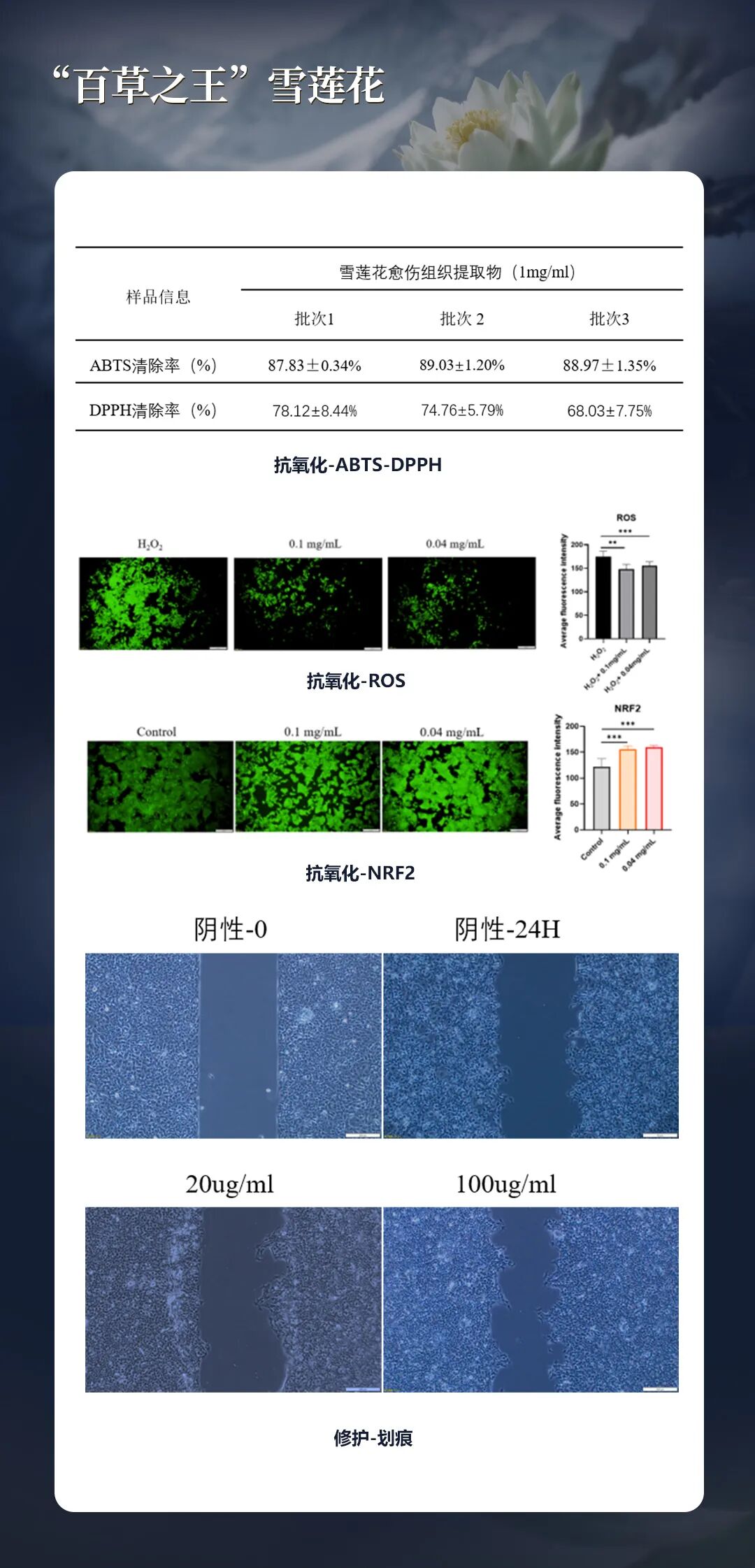体外细胞实验中,团队通过生化水平的ABTS法、DPP 法,及细胞水平的ROS、T-AOC测试,证实0.04-1.0mg/ml浓度提取物可抑制ROS积累、减少ROS生成,上调NRF2蛋白表达,抗氧化功效明确;在皮肤修护测试中,100μg/ml浓度的原料可显著提升角质形成细胞迁移率,使愈合率提高41%,充分证明其促进肌肤修复的能力。