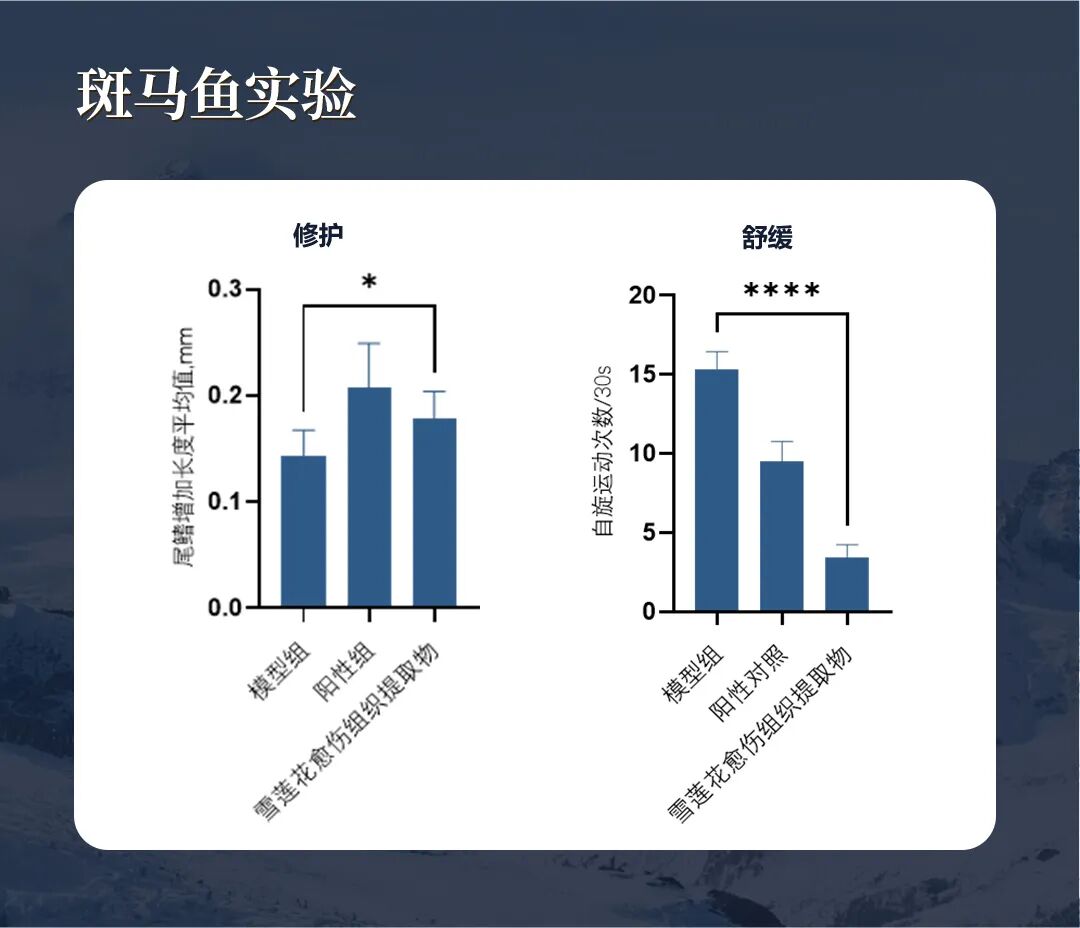 斑马鱼实验以直观生物模型验证功效:舒缓测试中,4.0μg/ml浓度原料有效降低斑马鱼皮肤中性粒细胞数量,舒缓功效约为80%,刺激症状显著缓解;修护测试中,相同浓度加快斑马鱼尾鳍修护速度24%,进一步佐证修护活性。