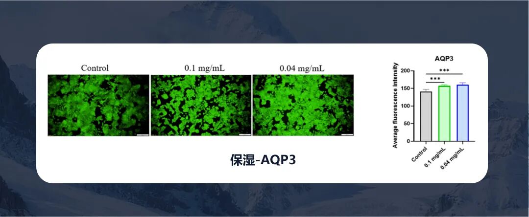 人体临床试验则以水通道蛋白3(AQP3)为核心评估指标:免疫荧光染色法测得,0.04mg/ml与0.1mg/ml浓度分别上调水通道蛋白AQP3达13.8%、11.5%,为保湿功效提供真实使用场景下的数据支撑。